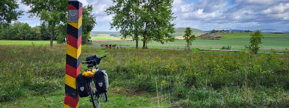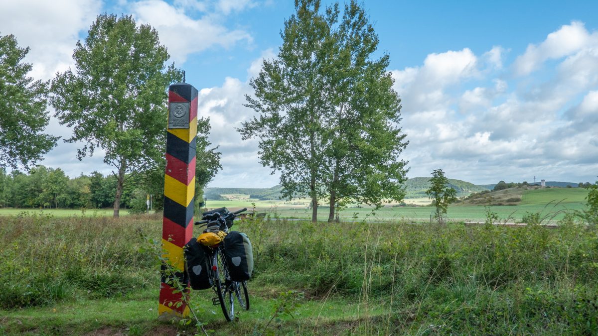 Hinter Hermannsfeld folgt noch einmal ein kurzer, steiler Anstieg, dann ist der höchste Punkt des Tages erreicht. Von hier aus geht es nicht nur bergab – auch die bayerische, pardon, fränkische Grenze ist nun überquert. Der Wind bläst hier oben so heftig, dass nur ein schnelles Beweisfoto drin ist, bevor die Fahrt weitergeht. Die Abfahrt könnte traumhaft sein – wäre da nicht der ständige Gegenwind.