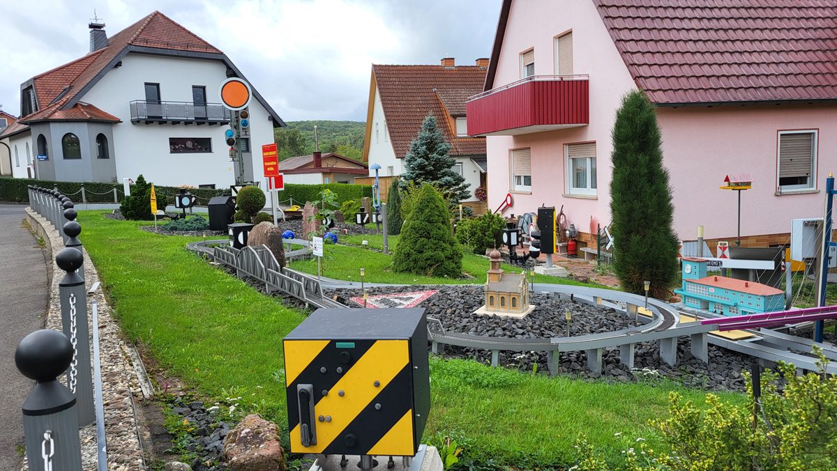 Im Vorgarten eines Einfamilienhäuschens in Aura, zeigt sich die ganze Aura eines Eisenbahnliebhabers. Signalanalgen, Modelbahngleise und andere Requisiten der Eisenbahninfrastruktur lockern das gepflegte Rasengrün vor dem Haus auf. Dem Gestalter des Vorgartens ist es wichtig den Zaungästen mitzuteilen, dass er nicht bei der Bahn arbeitet. Es ist einzig sein Hobby.