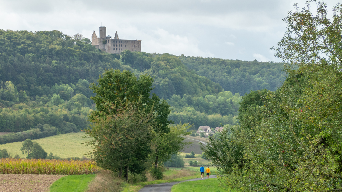 Kurz hinter Aura erscheint, auf dem Berg gegenüber, die Ruine der Trimburg. Gozzwin von Trimberg hat um 1100 den Grundstein für die Burg gelegt. Immer wieder wurde die Burg erweitert und bei nächster Gelegenheit auch wieder zerstört. 1806 ging die Burg in den Besitz des Königreichs Bayern und wurde als Baumaterial verkauft. 36 Jahre später hat Ludwig I. den „Rückbau“ ein Ende gesetzt.