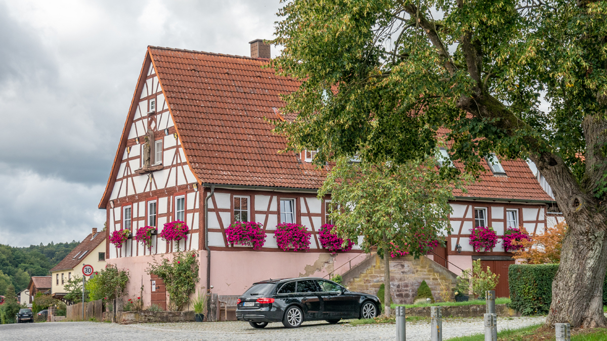 Angeblich liegt die Region ja im Windschatten der Rhön. Na dann schaumama. Auf die mondäne Kurstadt folgt sehr schnell unterfränkisches Landidyll. Der Radweg mäandert mit der Saale das Tal hinunter. Mal zeigt sich das Flüsschen, mal versteckt sie sich scheu hinter Bäumen und Büschen.